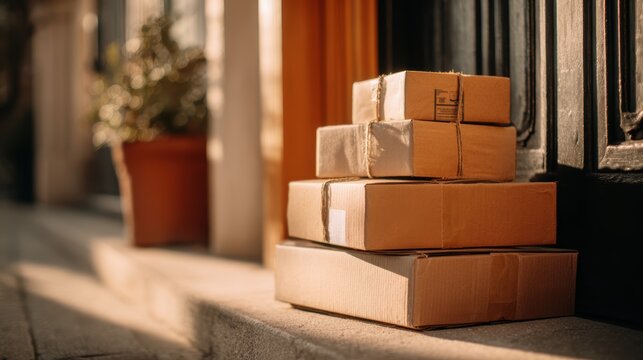 A close-up of a cardboard box wrapped in bubble wrap, sitting on a wooden desk, surrounded by various office and home items. The box is ready for shipping or delivery.