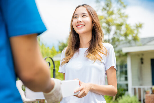 Sick Asian young woman receive medicine first aid pharmacy box from hospital delivery service, happy female receiving patient medicine drug from delivery man, healthcare medicine online concept