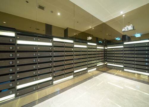 Closeup of rows of locked metal apartment or condominium mailboxes