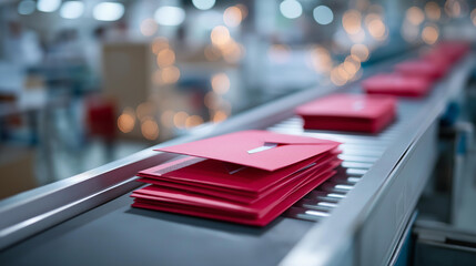 A mail sorter organizes holiday cards in a facility envelopes stamped and sorted conveyor belts moving bokeh from label printers adding efficiency efficient winter postal