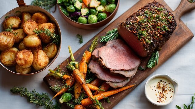Beef roast with vegetables and potatoes served on a wooden board at dinner time