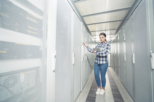 Computer engineer working on laptop computer with server room, data center, big data storage as backgrounds, digital technology, database, IT support, telecommunication concept
