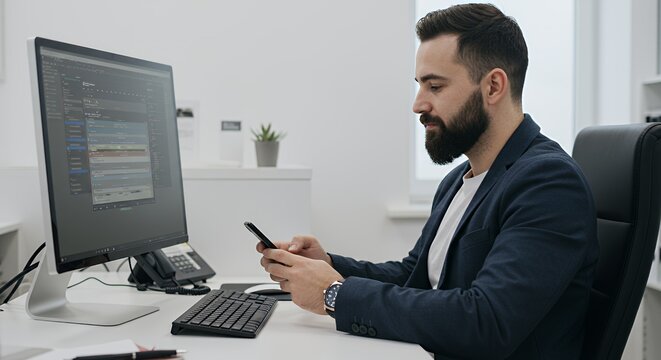 Focused businessman checks his phone while working at his desk, reviewing data on a large computer monitor in a modern office.
