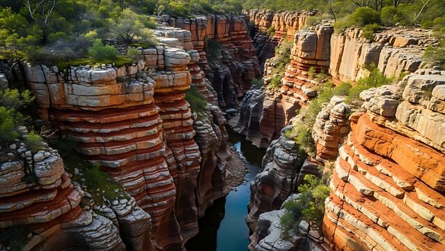 Breathtaking canyon landscape with layered red rock formations and serene river