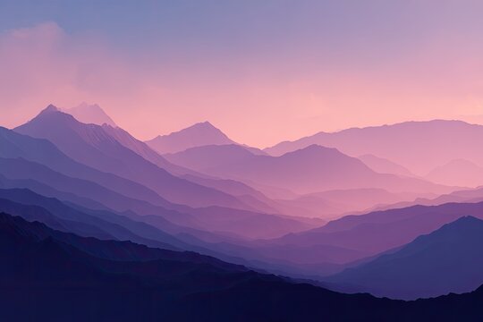 Serene mountain range with snow capped peak at sunrise with soft pastel sky and misty valleys