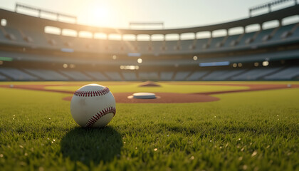 A cinematic closeup of home plate inside a 3D rendered baseball stadium with dramatic lighting, capturing intense sports moments, game anticipation, an iconic stadium backdrop for editorial visuals