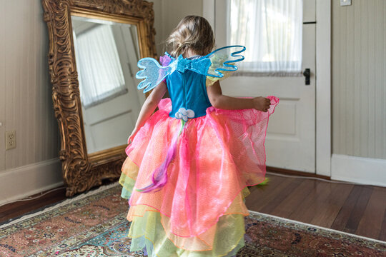 Unposed Colorful Fairy Dress-Up Playtime at Home with Young Girl, no visible face