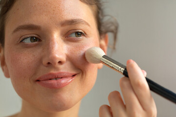 Beautiful young woman with clean perfect skin. Portrait of beauty model with natural nude make up and touching her face. Spa, skincare and wellness. Close up, copyspace.