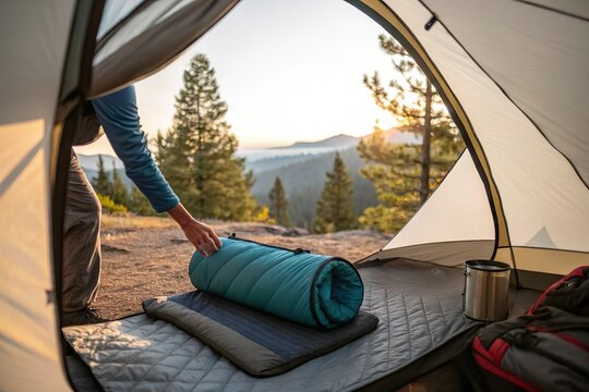 Camper embraces nature with augmented reality in forest tent