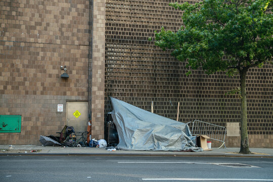 A temporary shelter made of tarps and shopping carts stands against a brick wall in an urban setting. The scene reflects homelessness and the challenges of life on the streets.