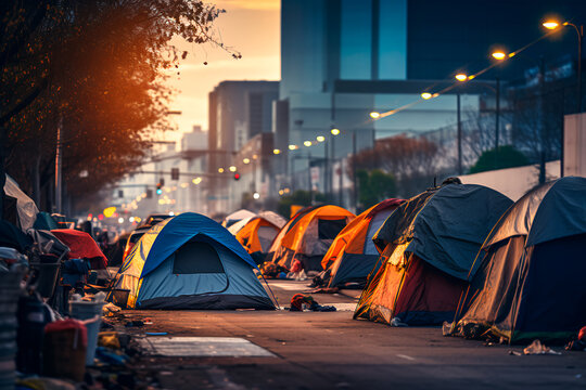 A makeshift tent camp for the homeless set up on a city street, highlighting a pressing urban issue.