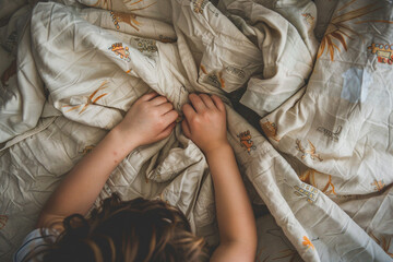 A cute sister and brother's hands building a makeshift tent with bedsheets, creating a cozy hideout.