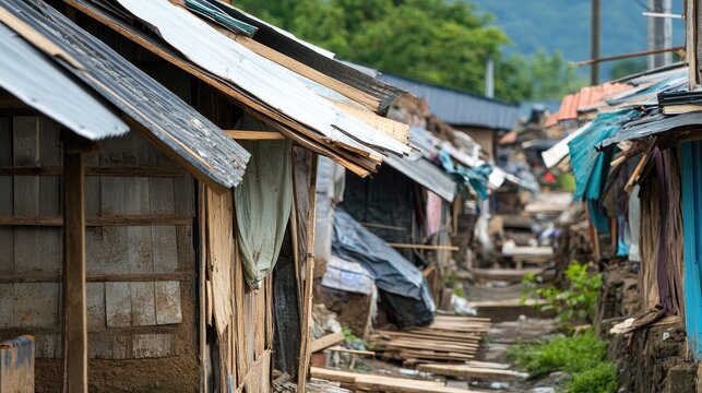 Makeshift shelters built from scrap materials in a neglected community