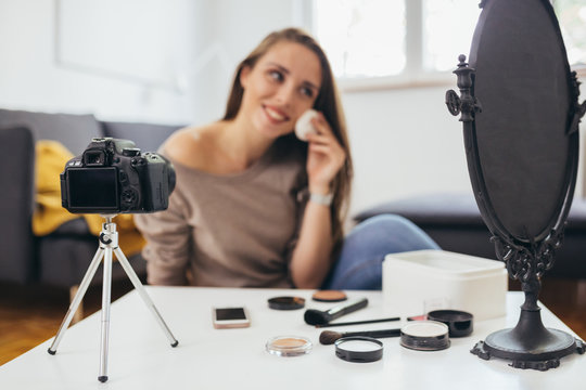 woman recording video about cosmetic makeup