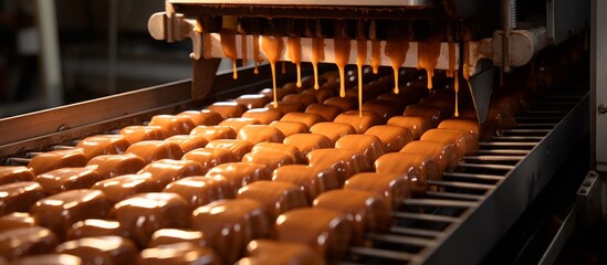 making machine of chocolate sweets. Chocolate factory. Sweets production process. Conveyor belt with sweet. Production in coconut sweets on cake factory