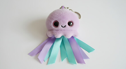 A tiny jellyfish plush keychain with dangling tentacles made of satin ribbons and glittery eyes.
