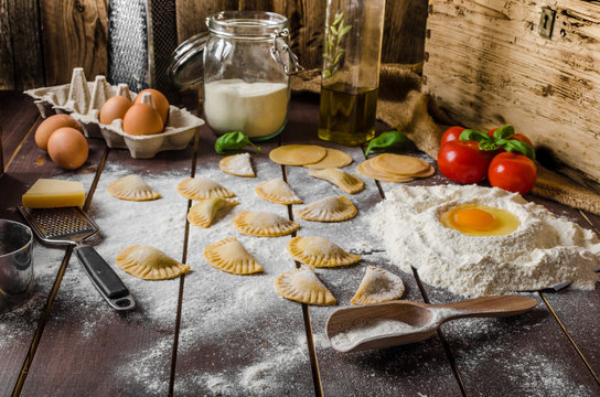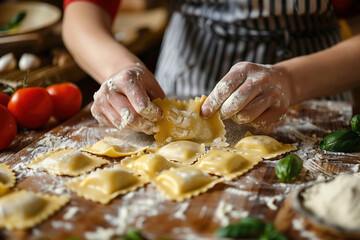 Cooking healthy Italian cuisine food gourmet preparation meal. Woman human chef making homemade ravioli or tortellini from fresh ingredient