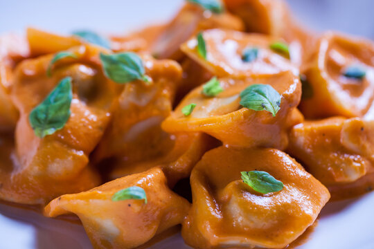 Delicious tortellini pasta in red tomato sauce with basil and parmesan cheese.