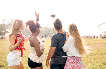 Friends at music festival taking live video to social media