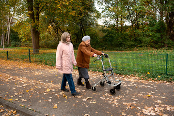 Woman and her elderly mother with walker taking a walk in the park covered in autumn leaves, spending family time together