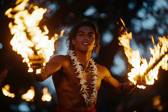 a Hawaiian fire dancer performing with flaming poi sticks at dusk.