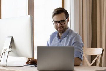 Happy smart millennial businessman in eyeglasses using laptop and computer monitor, working on online project on different devices, analyzing online sales or economic research data in home office.