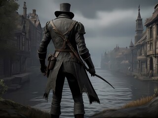 attractive young male assassin , a strong expression on his face, outfit with a hood, daggers in his hands. blurred background of old medieval town,fantasy fictional character