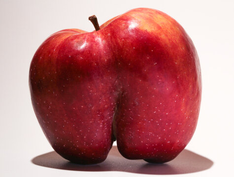 An ugly red apple. A fruit with a shape flaw on a white background.