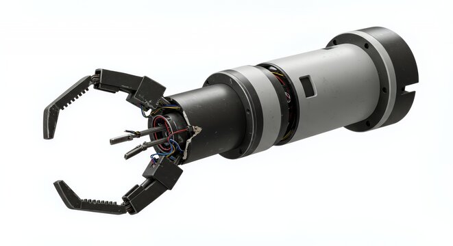 Dismantled Robotic Arm with Broken Gripper on White Screen Background Showcasing Technological Failure and Mechanical Despair Emphasizing Themes of Obsolescence