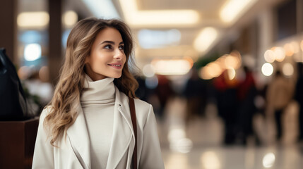 abstract blurs of a shopping mall interior embellished with Christmas ornaments and glowing lights
