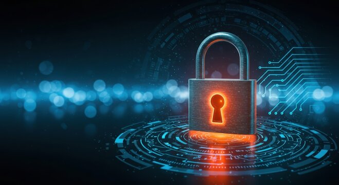 Digital security concept featuring a glowing padlock symbolizing data protection and cyber defense strategies
