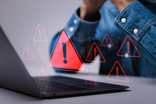 Ransomware malware attack and data breach. Spam virus with warning caution for notification on internet security protect. Person use laptop system hacked warning sign on virtual screen.