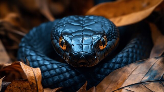 Mesmerizing black mamba snake slithering through dry leaves glistening dark scales intense stare extreme close up wildlife photography