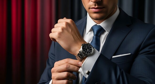 Businessman adjusting tie and suit jacket with watch