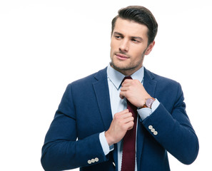 Handsome businessman straightening his tie
