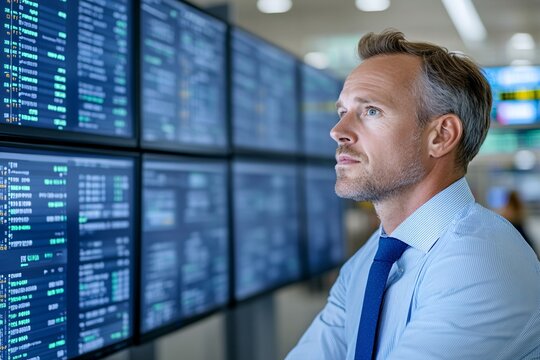 Man Analyzing Data In Dynamic Financial Workspace Images