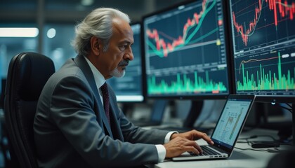 Man analyzing data on multiple computer screens displaying charts and graphs in a modern office setting