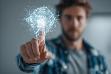 Man interacting with a digital innovation concept illustrating creativity and technology in a modern workspace setting
