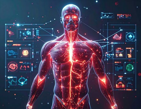 Human anatomy depicted with tech, glowing energy