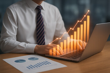 Bar chart representing a significant business growth and financial success, with an upward trend arrow overlaying the chart, while a businessman works on his laptop