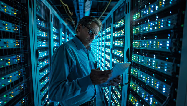 Man Analyzing Network Servers In Data Center Images