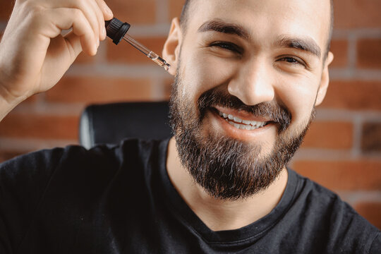 Oil for beard growth, hipster male use cosmetic pipette, barber shop skin and hair care for man