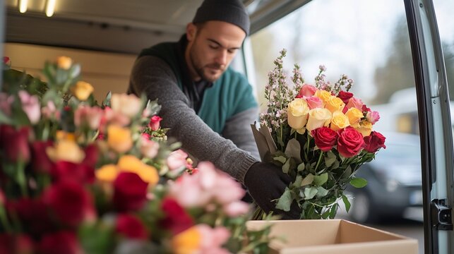 Florist arranging colorful rose bouquets in delivery van.