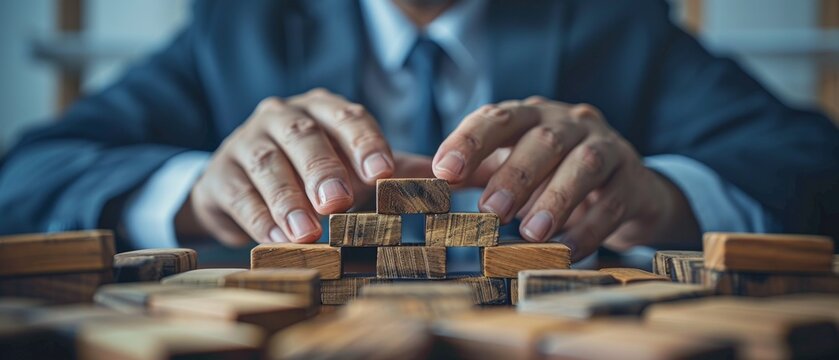 A man in a dark shirt is arranging wooden blocks with icons on them, possibly representing business or marketing concepts.
