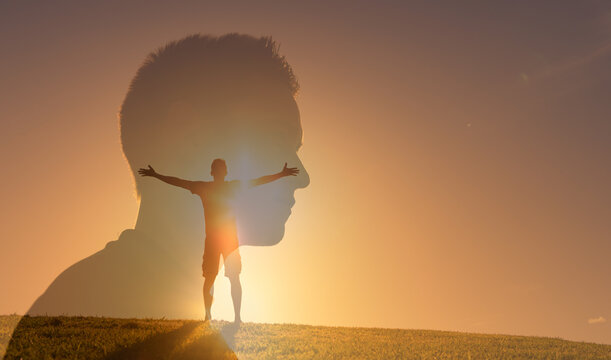Young happy man looking to the sunset in a calm relaxed state of mind.