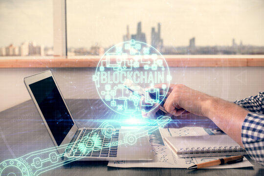 Double exposure of man's hands holding and using a phone and crypto currency blockchain theme drawing.