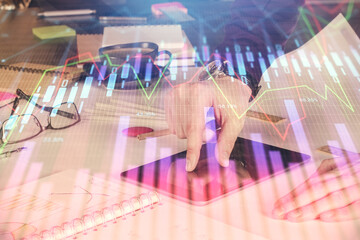 Double exposure of man's hand holding and using a digital device and data theme hologram drawing. Technology concept.