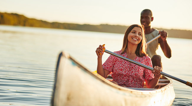 Laughing woman having a fun day canoeing with her boyfriend
