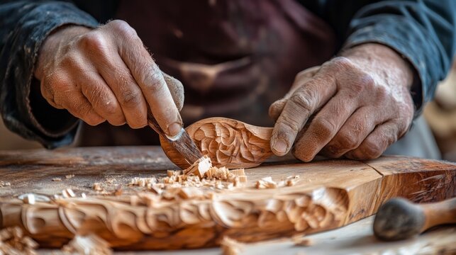 Experienced carpenter skillfully carving wood piece with chisel and hammer