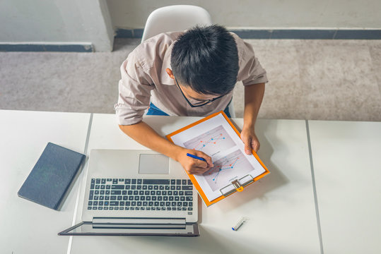 Farmer controls the soil and making a notes after plowing in the field. Agricultural concept